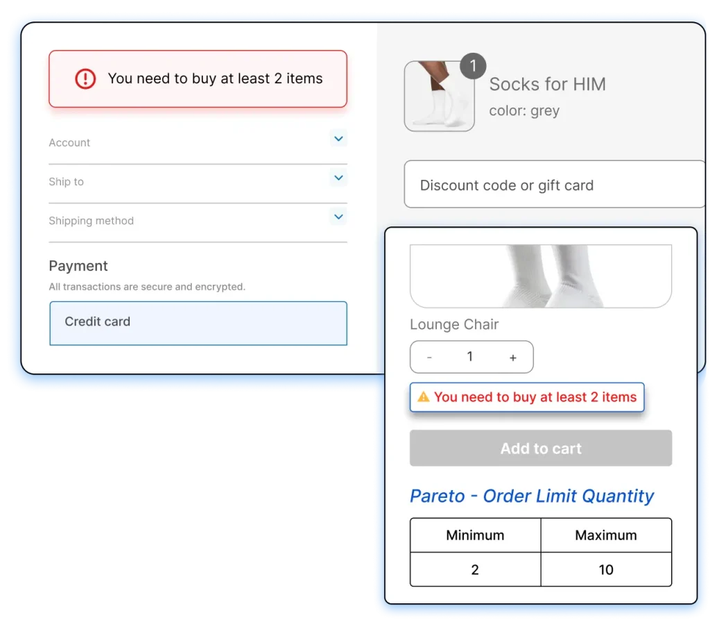 Gain control over how much or how little your customers can purchase with customizable minimum, maximum, and multiple order limits. Perfect for managing inventory and accommodating sales strategies during promotions or peak shopping seasons.