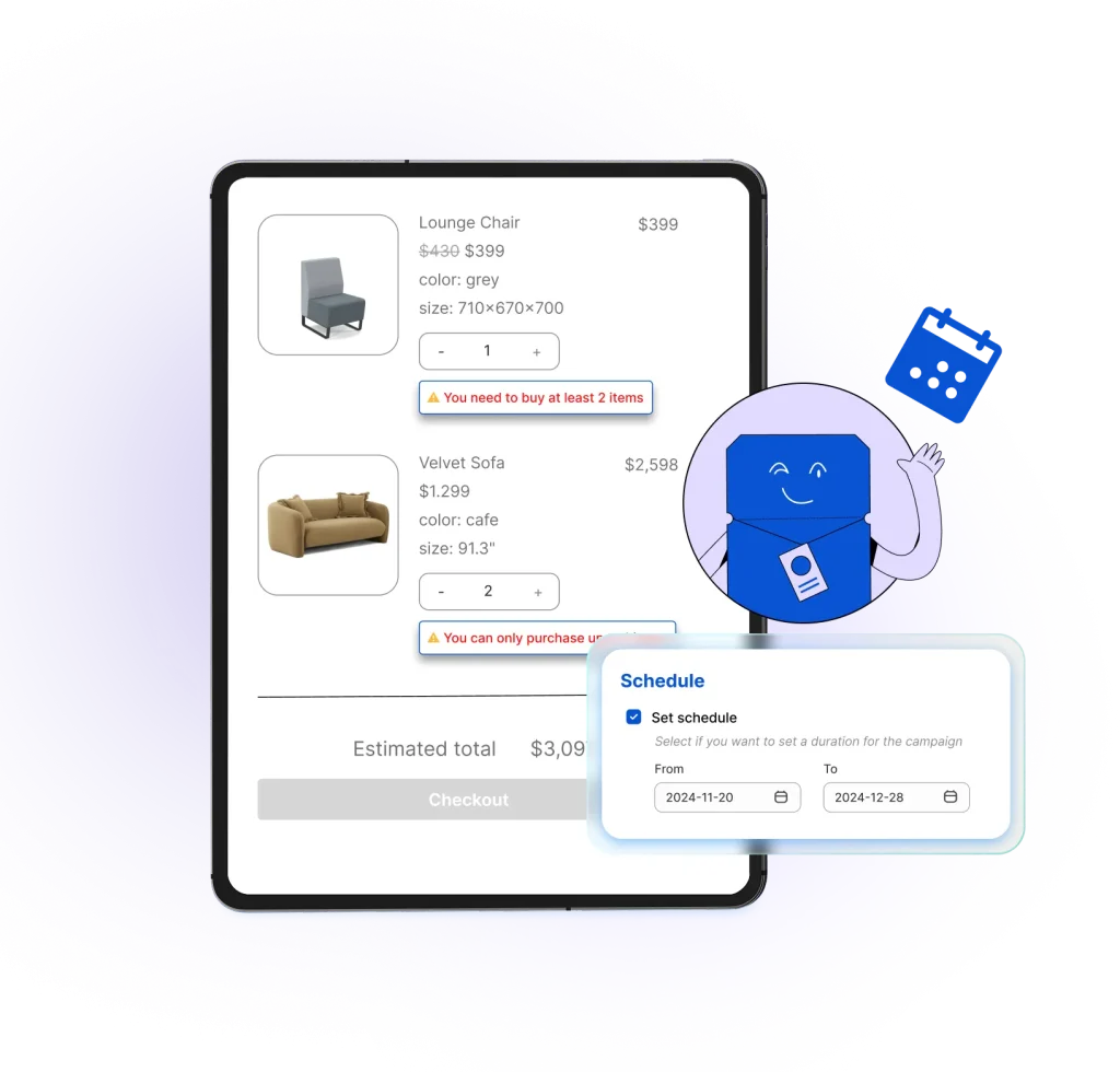 Automated scheduling for discount campaigns, including volume discounts, BOGO, and bundle offers. Set your promotions to run during optimal sales periods without manual intervention, ensuring they activate exactly when needed.